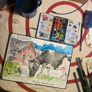Obwohl 2026 ja das Jahr des Pferdes ist, haben es mir die Kühe angetan! Ich kann jetzt schon sagen, dass der Besuch auf dem Öko-Bauernhof in Großbarkau ein großes Highlight des Jahres und eine Wohltat für die Seele war. Schaut doch gern mal auf meinem Instagram-Account @chrimaroart vorbei, dort habe ich ein kleines Reel mit Eindrücken bei Rieckens Landmilch und Eichhof erstellt. Inspiriert von diesem sonnigen schönen Tag mit den wundervollen Kühen und ihren Kälbern habe ich seit langem mal wieder ein Krafttier in meinem Aquarell-Sketchbook verewigt.